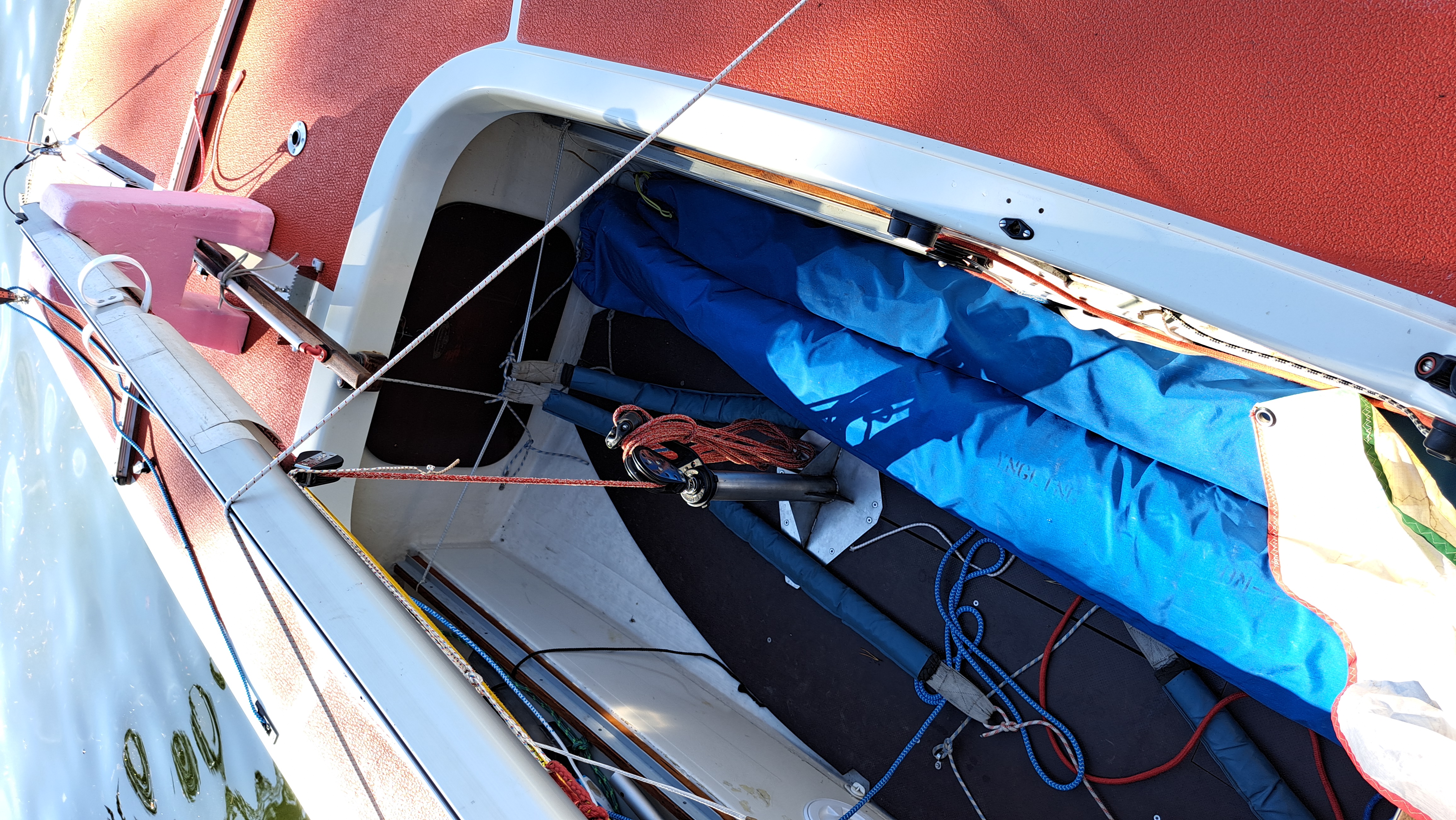 Mit dabei ist eine Winterpersenning, eine fast neue Ganzpersenning, Badeleiter, 2 Sätze Segel, ein Harbek Trailer mit Straßenzulassung Erstzulassung 1979 und div Zubehörteile.